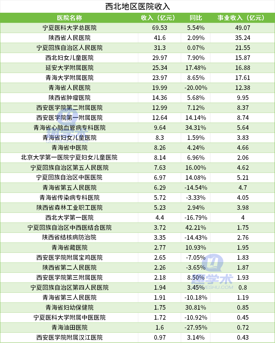 西北地区陕西、青海、宁夏3地公布了2024年度收入,共32家医院,其中10家收入下滑,最多下滑27.95%。