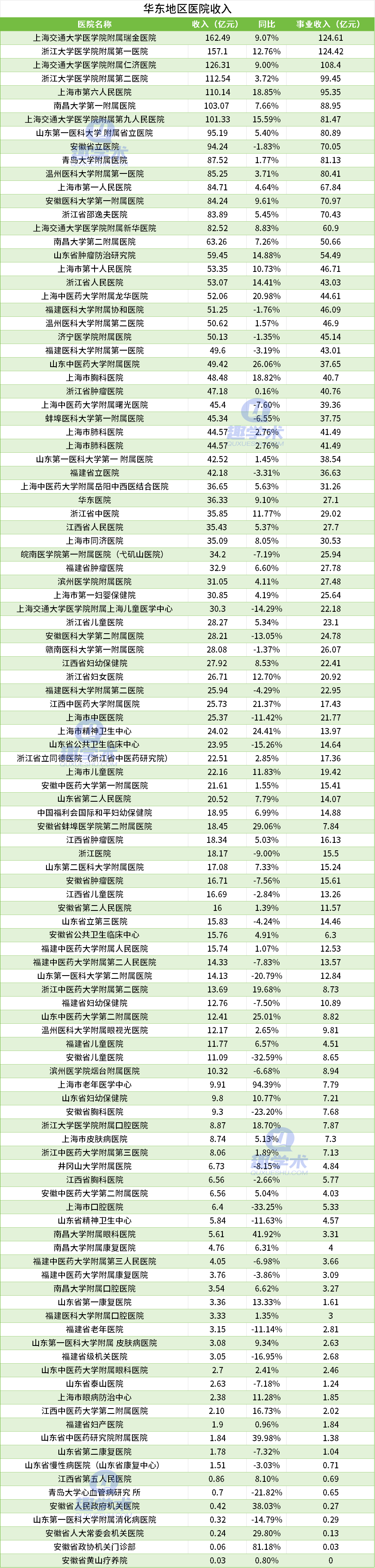 华东地区堪称医院领域的顶流所在地。上海、浙江、安徽、福建、江西、山东六省市有七家医院在2024年收入超过百亿,且113家医院中,有半数以上医院达成收入增长。