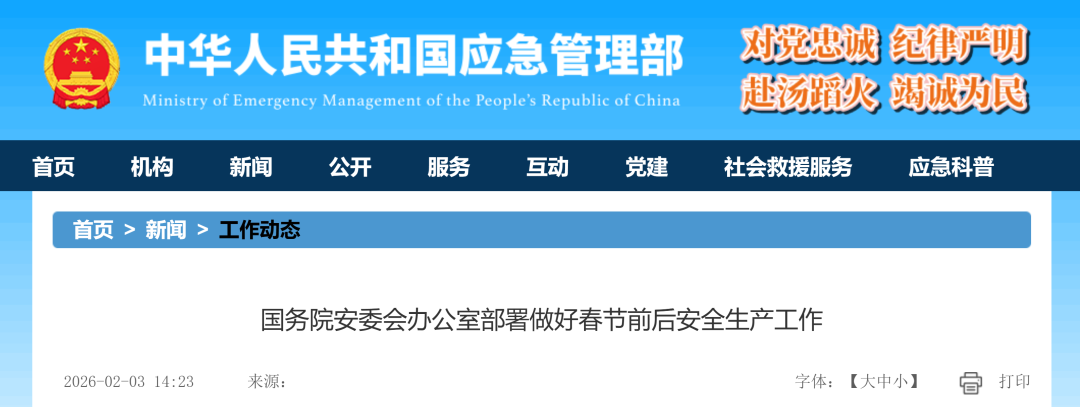 2月3日,国务院安委会办公室印发紧急通知,部署各地区、各有关部门和中央企业认真贯彻落实习近平总书记重要指示精神,切实做好春节前后安全生产工作,强化重大风险防控,坚决防范遏制群死群伤特别是重特大生产安全事故。通知指出,春节前后各类生产经营单位有的抢产量、赶工期,有的停产停工,有的复工复产集中,春运期间交通运输高位运行,人员密集场所安全风险聚集,冬季低温雨雪冰冻等恶劣天气多发频发,各类风险隐患交织叠加,安全生产须臾不可放松。要统筹好发展和安全,坚持底线思维、极限思维,结合岁末年初、春节前后安全形势特点,深入研判存在的突出风险,把安全防范责任措施压实到基层末梢,扎实推进安全生产治本攻坚,举一反三切实加强重点行业、重点场所安全隐患排查整治,针对性开展暗查暗访,加大对各类违法违规问题的执法查处力度,及时化解重大安全风险。通知要求,要突出问题导向加强火灾隐患排查整治。针对老年人集中居住等场所强化消防安全隐患排查整治,定期组织开展消防应急演练,坚决防范遏制火灾事故发生;持续深入推进高层建筑、“下店上宅”以及“三合一”“多合一”等经营性自建房重大火灾风险隐患排查整治,对照整治重点细排深查,实行清单式管理,强化跟踪督办,严格闭环整改;聚焦大型商业综合体、宾馆酒店、交通枢纽、农贸市场、医疗机构、校外培训机构、室内冰雪场馆等人员密集场所,着力整治电动自行车违规停放充电、违规动火作业、违规使用易燃可燃材料装修装饰、消防设施损坏故障等突出问题,严防堵塞安全出口、占用消防车通道等情况,确保生命通道畅通。通知强调,要聚焦重点强化烟花爆竹和危险化学品安全防范。采取针对性措施加强生产、经营、运输、寄递、燃放等全链条安全监管;进一步加大超标违禁产品排查整治力度,严肃查处将礼花弹等专业燃放类产品销售给个人、生产经营超标违禁产品、将专业燃放类标称为个人燃放类产品等违法违规行为;加大烟花爆竹“打非”工作力度,强化网络违法信息排查整治,严格行刑衔接,强化宣传引导和举报奖励。强化“两重点一重大”企业安全监管,督促企业严格落实冬季防冻、防凝等措施;强化动火、检维修等危险作业安全管控;严把节后复工复产关,做好安全提示和指导服务,督促企业加强风险防控,合理安排生产进度,坚决杜绝超负荷生产。通知要求,要举一反三强化其他重点行业领域安全监管。高度重视钢铁等工贸行业安全防范,强化高处、动火、检维修和有限空间等危险作业安全管理;加强冬季供暖锅炉、压力容器、大型游乐设施、客运索道、电梯等特种设备安全监管,聚焦重点领域、重点场所,督促使用单位严格遵守安全技术规范和检验检测要求,严禁设备“带病运行”;综合研判春运期间交通运输行业风险特点,紧盯重点运输企业、重点车(船)、重点人员、重点路段和重点水域等,加强低温雨雪冰冻、大雾大风等恶劣天气防御应对,严查“三超一疲劳”、非法营运、冒险运输等非法违法行为,确保群众出行安全;突出春节灯会、庙会、焰火表演、促销庆典等大型群众性活动,加强现场安全秩序维护,强化人流监测和管控,严防拥挤踩踏等风险;强化矿山安全“八条硬措施”硬落实;建筑施工、文化和旅游、渔业船舶、电力、水利、民爆、体育、通航等其他重点行业领域也要针对性加强春节前后安全防范措施,严防漏管失控。同时,要加强应急值守、事故调查和应对处置。进一步健全完善应急预案,在高风险区域和重点时段提前预置物资装备、前置救援力量,有针对性加强应急演练,确保遇有突发情况第一时间快速响应处置,切实维护人民群众生命财产安全和社会大局稳定,全力保障平安过节。