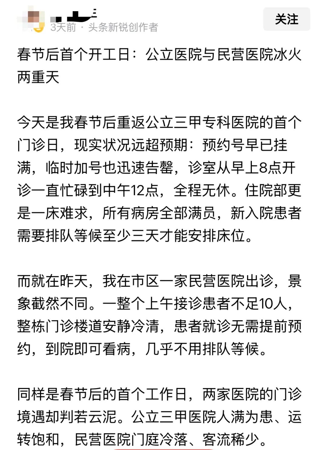 “而就在昨天,我在市区一家民营医院出诊,景象截然不同。一整个上午接诊患者不足10人,整栋门诊楼道安静冷清,患者就诊无需提前预约,到院即可看病,不用排队等候。同样是春节后的首个工作日,两家医院的门诊境遇却判若云泥。公立三甲医院人满为患、运转饱和,民营医院门庭冷落、客流稀少。”