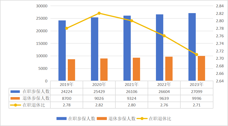 2023年,国家医保局坚持以习近平新时代中国特色社会主义思想为指导,深入学习贯彻党的二十大精神,坚决贯彻落实党中央、国务院决策部署,完整、准确、全面贯彻新发展理念,加快构建新发展格局,持续完善中国特色医疗保障制度,实现管理服务提质增效,医保制度运行总体平稳,群众待遇巩固完善,基金运行安全可持续。截至2023年底,全国基本医疗保险(以下简称基本医保)参保133389万人。2023年,全国基本医疗保险(含生育保险)基金总收入33501.36亿元,全国基本医疗保险(含生育保险)基金总支出28208.38亿元,2023年统筹基金当期结存5039.59亿元,累计结存33979.75亿元。1.参保人数。截至2023年底,职工医保参保37095万人,比上年增加852万人,增长2.3%,其中,在职职工27099万人,比上年增长1.9%;退休职工9996万人,比上年增长3.7%,在职退休比为2.71。企业、机关事业、灵活就业等其他人员参保人数(包括在职职工和退休人员)分别为24367万人、6668万人、6060万人。职工医保统账结合和单建统筹参保人数分别为34525万人、2569万人。2.基金收支。2023年,职工医保基金(含生育保险)收入22931.65亿元,比上年增长10.3%。基金(含生育保险)支出17750.73亿元,比上年增长16.4%。2023年,职工医保统筹基金(含生育保险)收入16580.30亿元,比上年增长26.0%;统筹基金(含生育保险)支出11652.77亿元,比上年增长21.9%;统筹基金(含生育保险)当期结存4927.53 亿元,累计结存(含生育保险)26316.05亿元。2023年,职工医保个人账户收入6351.35亿元,个人账户支出6097.95亿元,个人账户当期结存253.39亿元,累计结存13954.21亿元。3.待遇享受。2023年职工参保人员待遇享受人次较快增长,达25.3亿人次,比上年增长20.2%。其中,普通门急诊21.8亿人次,门诊慢特病2.7亿人次,住院0.8亿人次。此外,享受药店购药23亿人次。2023年,职工医保参保人员住院率21.86%。其中,在职职工住院率为11.93%,退休人员住院率为49.02%。次均住院费用为12175元,其中,在三级、二级、一级及以下医疗机构(含未定级)的次均住院费用分别为14586元、8665元、6310元。次均住院床日9.8天。2019-2023年职工医保次均住院费用和住院人次2023年职工医保参保人员医药总费用19879.79亿元,比上年增长21.3%,其中,在医疗机构发生17408.48亿元,在药店发生2471.31亿元。医疗机构发生费用中,在职职工医疗费用7501.76亿元,退休人员医疗费用9906.71亿元。职工医保住院费用目录内基金支付比例84.6%,三级、二级、一级及以下医疗机构支付比例分别为83.5%、87.4%、89.4%。1.参保人数。截至2023年底,城乡居民基本医疗保险(以下简称居民医保)参保96294万人。2.基金收支。2023年,居民医保基金收入10569.71亿元,支出10457.65亿元,当期结存112.06亿元,累计结存7663.70亿元。3.待遇享受。2023年,参加居民医保人员享受待遇26.1亿人次,比上年增长21.1%。其中,普通门急诊20.8亿人次,门诊慢特病3.4亿人次,住院2亿人次。次均住院费用7674元,其中,在三级、二级、一级及以下医疗机构(含未定级)的次均住院费用分别为12765元、6205元、2943元。居民医保参保人员住院率为20.7%,次均住院床日8.8天。2023年,居民医保参保人员医药费用19581.56亿元,其中,在医疗机构费用19426.97亿元,在药店购药费用154.59亿元。比上年增长19.4%。居民医保住院费用目录内基金支付比例68.1%,三级、二级、一级及以下医疗机构支付比例分别为63.2%、72.4%、80.8%。2019-2023年居民医保次均住院费用和住院人次2023年,全国参加生育保险24903万人,比上年增加282万人。从2023年起,进一步规范统一生育保险待遇享受统计口径,将产前检查、计划生育人次纳入生育保险待遇统计,享受各项生育保险待遇2834万人次,比上年增加1065万人次,比上年增长60.2%。生育保险基金支出1177.23亿元。2019-2023年参加生育保险人数和待遇享受人次2023年,全国医疗救助支出746亿元,医疗救助基金资助8020万人(不含其他部门资助参保人数)参加基本医疗保险,实施门诊和住院救助15340万人次,全国次均住院救助、门诊救助分别为1241元、132元。2023年,中央财政安排医疗救助补助资金297亿元。全国纳入监测范围农村低收入人口参保率稳定在99%以上。各项医保综合帮扶政策惠及农村低收入人口就医1.86亿人次,减轻农村低收入人口医疗费用负担1883.5亿元。《国家基本医疗保险、工伤保险和生育保险药品目录(2023年)》收载西药和中成药共3088种,其中,西药1698种,中成药1390种,另目录含中药饮片892种。2023年调整中新纳入药品126种。2019-2023年版国家医保药品目录收载的西药和中成药自2018年国家医保局成立以来,连续6年开展医保药品目录动态调整,累计744种药品新增进入目录范围。2023年,协议期内谈判药品报销2.4亿人次,通过谈判降价和医保报销,当年累计为患者减负近2300亿元。截至2023年底,全国384个统筹地区开展了按病组和病种分值(DRG/DIP)付费,其中,开展DRG付费的城市190个,开展DIP付费的城市192个,天津、上海两个直辖市DRG和DIP并行付费。2023年,开展第八批、第九批国家组织药品集采,涉及80种药品,平均降价57%。开展第四批国家组织人工晶体及运动医学类耗材集采,平均降价70%。截至目前,共开展九批国家组织药品集采,覆盖374种药品,开展四批国家组织高值医用耗材集采,覆盖冠脉支架、人工关节、骨科脊柱类耗材、人工晶体和运动医学类耗材等大类。2023年,启动挂网药品价格治理,开展统一挂网药品价格数据信息规范工作。监测