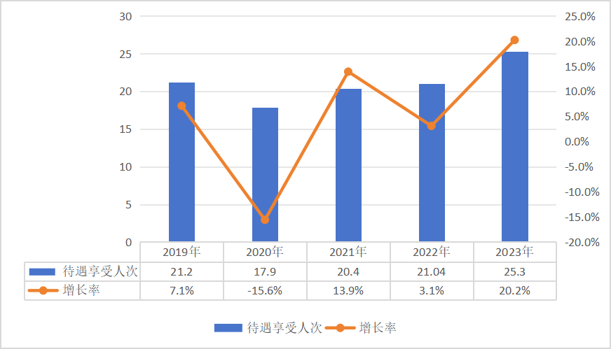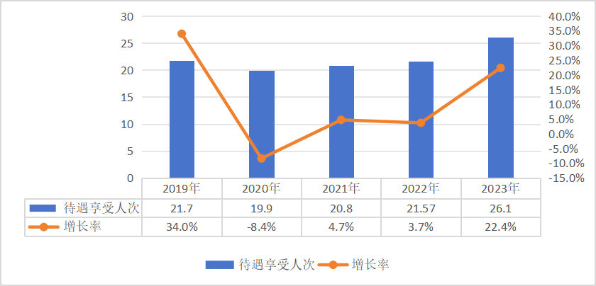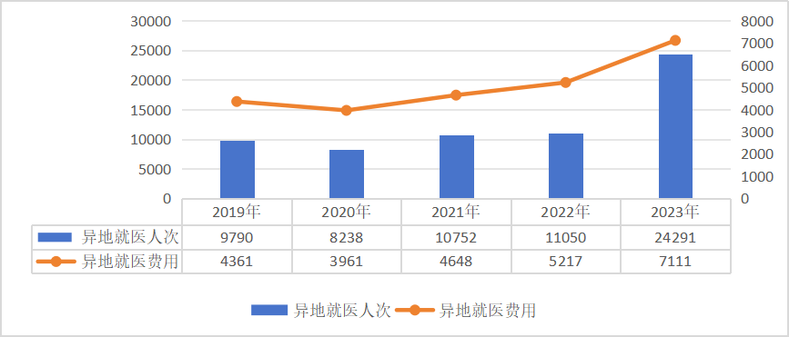 2023年,全国普通门急诊、门诊慢特病及住院异地就医2.43亿人次,其中,职工医保异地就医1.61亿人次(包括省内异地就医1.01亿人次,省外异地就医0.6亿人次),居民医保异地就医8214.36万人次(包括省内异地就医5196.78万人次,省外异地就医 3017.58万人次)。全国普通门急诊、门诊慢特病及住院异地就医费用7111.05亿元,其中,职工医保异地就医费用2806.51亿元,居民医保异地就医费用4304.54亿元。2023年,全国医保系统共检查定点医药机构80.2万家,处理违法违规机构45.1万家,其中,解除医保服务协议4176家,行政处罚20586家,移交司法机关367家;处理违法违规人员32690人,其中,暂停医疗费用联网结算4883人,移交司法机关1399人。2023年,追回医保基金186.5亿元。2023年,国家医保局组织飞行检查34组次,检查定点医疗机构66家、医保经办机构32家,查出涉嫌违法违规资金9.2亿元。在被检查医药机构中通过协议处理拒付及追回资金134.07亿元,收取违约金14.47亿元。拒付或追回资金涉及定点医药机构19.87万家。2023年,49个试点城市参加长期护理保险人数共18330.87万人,享受待遇人数134.29万人。2023年基金收入243.63亿元,基金支出118.56亿元。长期护理保险定点服务机构8080家,护理服务人员30.28万人。2020-2023年参加长期护理保险人数和享受待遇人数说明:本公报中部分数据因四舍五入,总计与分项合计略有差异。