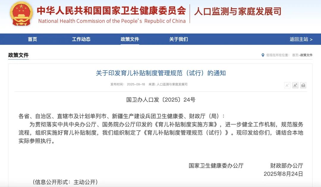 党的二十届三中全会部署建立生育补贴制度。2025年《政府工作报告》明确提出发放育儿补贴。2025年,中共中央办公厅、国务院办公厅印发《育儿补贴制度实施方案》,规定育儿补贴制度有关管理规范由国家卫生健康委、财政部另行制定。为保障育儿补贴制度顺利实施,进一步健全工作机制,规范服务流程,国家卫生健康委会同财政部研究制定了《管理规范》。