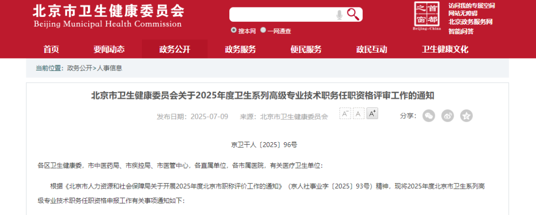 传染病防治成为职称晋升和聘任的必备条件! 传染病防治成为职称晋升和聘任的必备条件! “定向评价、定向使用”引人注目 近期,职称晋升新规定密集出台,这对不少资深主治医师而言喜忧参半。 2025年7月9日,北京市卫健委印发《关于2025年度卫生系列高级专业技术职务任职资格评审工作的通知》(以下简称《通知》),对本年度卫生系列高级职称评审工作作出系统部署。 图源:北京市卫健委 该文件亮点突出,坚决破除 “唯论文” 倾向,少提论文要求,重点将临床工作质量作为评价指标,引导医生专注临床。 例如,《通知》明确,要将门诊工作时间、现场工作时间、收治病人数量、手术数量、检查报告数量、药品调配和处方审核数量、护理工作时间等作为申报条件。 将诊疗疾病覆盖范围、单病种诊疗例数、并发症发生例数、治疗效果、开展手术或操作的范围、手术难度和质量、平均住院日、次均费用、处方点评质量、护理服务质量、现场处置案例数等作为重要评价指标,科学准确评价其职业能力和水平。 其次,疾病诊断相关分组(DRG)数据的突破性应用是本次改革的亮点。 今年,北京市在部分专业试点利用病案首页和疾病诊断相关分组(DRG)数据,从技术能力、质量安全、资源利用和患者管理四个评价维度,评价申报人的临床工作质量,探索建立“临床评价数据、案例代表作、专家评审”三位一体的职称评审路径,进一步提升职称评审的专业性和公信力。 为激励人才扎根基层,北京在区以下卫生事业单位推行职称 “定向评价、定向使用”。 文件规定,对在基层社区卫生服务机构工作满30年且中级职称取得满10年,仍在诊疗一线岗位的卫生专业技术人员通过加大职业道德、考核结果、基层服务水平、群众认可度等方面的权重评定高级职称。 “定向评价”采取单独分组、单独评审的方式,取得的职称限定在本区内有效。 “定向评价、定向使用”的高级岗位实行总量控制、比例单列、专岗专用,不占专业技术岗位结构比例,与常设岗位分开设置、单独管理,并向乡镇卫生院倾斜。 更重磅的是,北京市还新增了一项晋升副高的必备条件:首都所有卫生专业技术人员需学习重点传染病防治知识,每年不少于 20 学时。 在本年度卫生系列高级专业技术职务任职资格答辩中,各专业答辩评议组将继续考核申报人员传染病防治知识,并作为职称晋升和职务聘任的必备条件之一。 面对公共卫生新形势,北京将该考核设为硬指标,要求每年完成 20 学时线上培训并通过答辩专项考核,这一做法或为其他省份提供借鉴。 最后,北京市还罕见地提出了“一票否决制”。 文件规定,用人单位须建立健全医德医风考核制度,将利用职务之便索要、非法收受财物或牟取其他不正当利益等行为纳入考核范围。完善诚信承诺和失信惩戒机制,实行学术造假“一票否决制”,对通过弄虚作假等违纪违规行为取得的职称,一律予以撤销。 工作15年中级7年可直接申报副高 职称、编制都在向基层倾斜 重基层、强基层正在各省贯彻 国家愈发重视基层医疗,除北京的 “定向评价、定向使用”,浙江近日也出台类似政策。 2025年6月3日,浙江省卫生健康委、省财政厅等四部门印发《浙江省新时代大学生乡村医生队伍建设赋能计划实施方案》(以下简称《方案》),引起巨大讨论。 该《方案》表示,要给大学生乡村医生足够的职称保障。在基层医疗卫生机构工作的大学生乡村医生,只要通过中级职称考试即可直接聘任;申报高级职称时,在学历、年限方面适当放宽,且不再受规范化培训(规培)限制。 针对长期扎根基层的医生,该《方案》还特别设置了“服务年限+任职年限”的晋升通道:大专毕业、在岗满15年、任主治医师满7年者可申报副主任医师;服务满20年、受聘副主任医师满5年者可申报主任医师。 该《方案》同时表示,要给大学生乡村医生预留足够的编制,编制要向大学生乡村医生倾斜。 例如,文件明确,通过大学生乡村医生专项计划、定向培育等途径进入大学生乡村医生岗位的,在达到最低服务年限要求后,可参与县域医共体内岗位竞聘,同等条件下可优先聘用到乡镇卫生院、县级医院岗位工作。 医共体通过定向培养招录大学生乡村医生,应在核定的编制限额内进行;空编不足、确有困难的,可适当通过周转编制方式予以支持,具体由各地根据近年内自然减员等实际把握。 随着各地落实 “重基层、强基层”,职称和编制不断向基层医生倾斜,就连大三甲医生晋升副高需到基层服务的要求也日益严格。 根据《湖南省卫生系列执业医师晋升副主任医师前下基层服务工作实施管理办法》中规定:执业医师在晋升副主任医师前应到基层医疗卫生机构服务一年及以上,每次连续服务不少于6个月,特殊情况按程序备案。其中明确提出,接收单位应及时将下基层服务人员的起止时限、每月工作排班表等信息录入平台,每月公示上班与考勤情况,考勤应严格要求并记录。 职称晋升收紧,医德成重要考量 2024年8月20日,人社部发布了《职称评审监管暂行规定》,其中提到要严格监管职称晋升,从申报资质审查、材料核验到评审流程,实施全链条监管,用人单位要负连带责任。值得注意的是,近期还启动倒查机制,近两年因材料造假被追溯、职称作废的案例频繁公示,彰显改革决心。 在强力监管力度不断加大的背景下,近年来卫生高