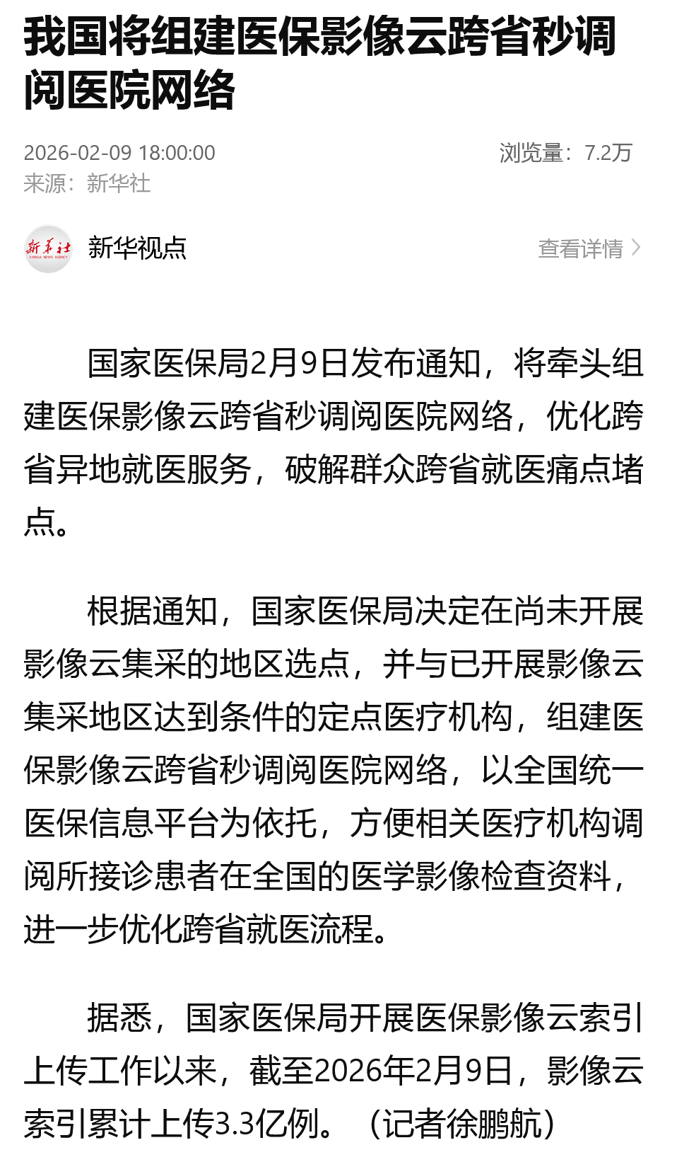 国家医保局2月9日发布通知,将牵头组建医保影像云跨省秒调阅医院网络,优化跨省异地就医服务,破解群众跨省就医痛点堵点。 根据通知,国家医保局决定在尚未开展影像云集采的地区选点,并与已开展影像云集采地区达到条件的定点医疗机构,组建医保影像云跨省秒调阅医院网络,以全国统一医保信息平台为依托,方便相关医疗机构调阅所接诊患者在全国的医学影像检查资料,进一步优化跨省就医流程。 据悉,国家医保局开展医保影像云索引上传工作以来,截至2026年2月9日,影像云索引累计上传3.3亿例。 来源:新华社