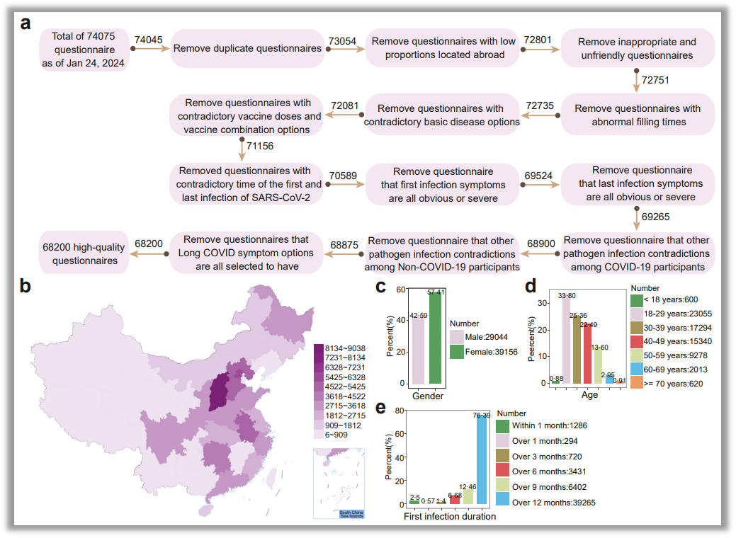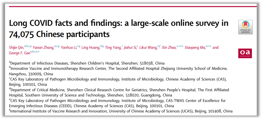 长新冠(Long COVID)定义为初次感染后三个月或更长时间出现持续或新出现的症状,且没有其他明显的解释。全球约有1.4亿人受其影响。症状广泛,包括疲劳、脑雾、头晕、记忆力下降、心悸、胃肠不适、嗅觉或味觉丧失、慢性咳嗽、胸痛、脱发等,并且可能影响多个器官系统,导致认知和情绪障碍。根据不同的研究,长新冠的患病率差异较大,范围在10%到60%之间,目前已成为全球重要的公共卫生问题。在中国,长新冠的研究仍然相对较少,目前的研究大多集中于住院患者、早期SARS-CoV-2变异株或特定症状的调查。由于中国实施了长期的清零措施,重症和死亡病例显著减少,且中国居民的免疫背景相对统一。然而,随着清零策略的调整,普通人群中的长新冠特征仍不明确。近日,国际权威医学期刊《柳叶刀》子刊《柳叶刀-区域健康(西太平洋)》在线发表高福院士《长新冠事实与发现:一项针对74075名中国受访者的大规模在线调查》(Long COVID facts and findings: a large-scale online survey in 74,075 Chinese participants)一文。通过在PubMed数据库检索“long COVID”和“中国”关键词,研究者发现,2023年1月1日之后,共有235篇相关文献被收录,其中83篇为综述或系统综述。剩余的研究大致可分为两类:一类探讨了长新冠的发病机制、异常分子标记或遗传因素;另一类则关注长新冠症状与基线特征之间的关系,尽管大多数研究的样本主要集中在上海、北京、广州和香港,无法全面代表全国情况。此外,很多研究重点关注住院患者(包括中重症病例),而大多数在过去一年感染的人并未住院。因此,关于中国广大居民长新冠的流行病学数据仍然缺乏,需要进一步调查以明确长新冠的基线特征、免疫背景及再感染的影响。为填补这一研究空白,高福院士团队采用了国内最大规模的在线调查,旨在分析中国居民长新冠的流行病学特征及相关因素。研究方法包括回顾性问卷调查,并采用多元Logistic回归分析方法探讨基线特征、疫苗接种、病原感染与长新冠症状之间的关系。此次研究涵盖了74,075名参与者,最终收回有效问卷68,200份。研究结果表明,最常见的长新冠症状包括疲劳(30.53%)、记忆力下降(27.93%)、运动能力下降(18.29%)和脑雾(16.87%)。在仅感染一次的患者中,这些症状的患病率相对较低:疲劳为24.85%,记忆力下降为18.11%,运动能力下降为12.52%。此外,女性患者更容易出现长新冠症状,且症状呈现年龄差异,老年人群体中,睡眠障碍和肌肉/关节疼痛更为常见。研究还发现,中国北方地区的长新冠发生率较高,可能与温度梯度有关。危险因素包括合并基础疾病、饮酒、吸烟以及急性感染的严重程度。再次感染与较轻的症状相关,但其导致的长新冠发病率和严重程度较高。接种疫苗,尤其是多轮增强疫苗接种,能够显著降低30%~70%的长期症状。此外,患者还自报告了更多细菌、流感和支原体感染病例,8%~10%的患者还出现了其他慢性疾病。本研究通过大规模的在线调查,提供了对中国居民长新冠情况的深入分析。结果表明,10%~30%的患者报告出现长新冠症状(包括反复感染者)。基于此,识别长新冠的危险因素并监测高风险人群对于公共卫生工作至关重要。这项研究为全球长新冠的研究提供了宝贵的资料,并为防控策略的制定提供了参考。该研究由高福院士主持,得到了比尔及梅琳达·盖茨基金会、中国博士后科学基金及广东省基础与应用基础研究基金的支持。参考资料:Long COVID facts and findings: a large-scale online survey in 74,075 Chinese participantsQin, Shijie et al. The Lancet Regional Health – Western Pacific, Volume 52, 101218