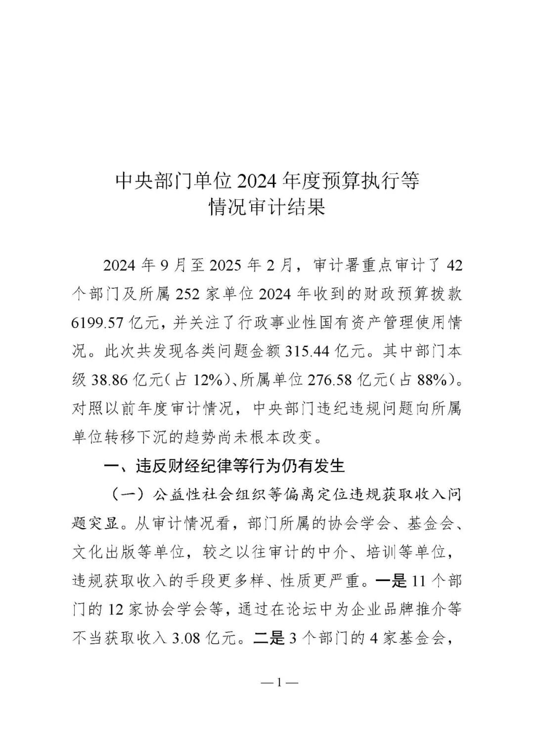 2024 年9月至2025年2月,审计署重点审计了42个部门及所属252家单位2024 年收到的财政预算拨款6199.57亿元,并关注了行政事业性国有资产管理使用情况。此次共发现各类问题金额315.44 亿元。