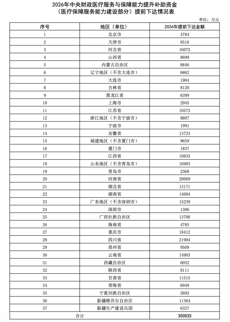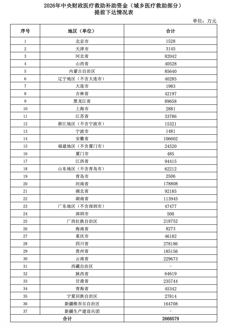 据统计,本次提前下达金额共计约4165.57亿元,其中2026年中央财政城乡居民基本医疗保险补助提前下达约3863.66亿元,提前下达2026年中央财政医疗救助补助资金(城乡医疗救助部分)预算266.86亿元,提前下达2026年中央财政医疗服务与保障能力提升补助资金(医疗保障服务能力建设部分)35.05亿元。