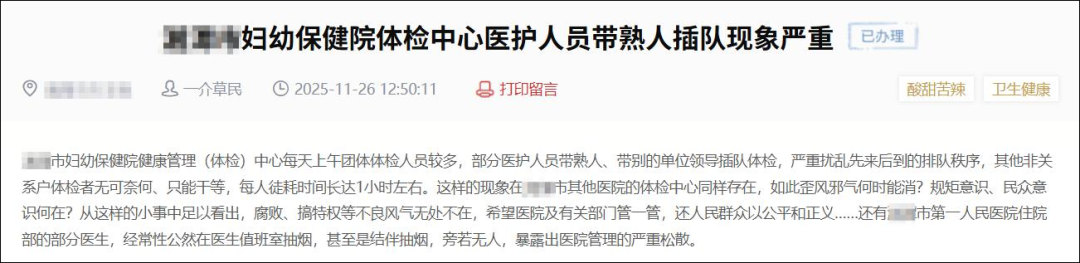 又见医生带熟人插队反被举报、曝光的新闻! 多名医务人员被通报! 整治“熟人看病”乱象 近日,有网友在当地官方平台发帖称,某市妇幼保健院健康管理(体检)中心每天上午团体体检人员较多,部分医护人员带熟人、其他单位领导插队体检,严重扰乱了先来后到的排队秩序,其他非关系户体检者只能无奈干等,每人徒耗时间约1个小时。 一周后,该市卫健委回复称,已责成相关单位对存在的问题深刻查找原因,举一反三立即整改。同时,将进一步加强管理,督促各医疗机构切实优化就医流程,加强就诊流程宣传引导,规范医务人员行为举止。 生活里,不少 “私下变通” 的情况并不罕见。放到医院场景中,即便这类行为被身边同事撞见,大多也会因见怪不怪而默不作声。可一旦这种超出规则的操作被有心之人曝光于舆论之下,性质便会彻底反转,其引发的连锁反应与后续后果,绝非简单应对就能平息。 某市卫生健康局曾通报一起处置案例:市民小丽(化名)在医院彩超室候诊时遇他人插队,一小时后询问就诊时间,遭医生冷漠回应,还与某医务人员发生言语冲突。事后,卫健部门对涉事人员作出全院通报批评、取消一季度绩效工资、调离原岗位并辞退的处罚。 因类似不当行为被辞退的医务人员并非个例。 某医院工作人员帮家属插队接种疫苗一事也引发热议。网友投诉称,自己和多人在烈日下排队几小时接种疫苗,轮到自己时却被告知疫苗不足需次日再来,而该医院医务人员却带着亲属插队接种。经过调查,原因是医院物业导诊员陈某在接种现场帮家人插队,扰乱秩序造成不良影响。卫健委对其作出通报批评、扣发当事人200元绩效、留用察看(再犯即辞退)等处理。 卫健委定性: 熟人插队属于腐败行为 近年来纪律部门已明确将熟人看病行为定性为 “微腐败”。所谓 “微腐败”,本质上是公权的滥用,其显著特点一是 “小”,单个行为看似影响有限;二是 “多”,在一定范围内普遍存在。长期以来,人们对这种现象司空见惯,甚至习以为常,觉得太过较真就是 “上纲上线”,不近人情。于是,多数人选择听之任之,更有甚者还会主动效仿,使得这一问题陷入恶性循环。 正是意识到其潜在的严重危害,多地才不得不出台明文规定,严令禁止医院员工带熟人插队,力求从制度层面斩断这一 “微腐败” 的链条,重塑医疗环境的公平与公正。 黑龙江省卫生健康委和黑龙江省中医药管理局联合下发《关于优化医疗卫生环境做到“看病不求人”的实施意见》,要求各级卫生健康行政部门和各级各类医疗机构严禁部门领导、医院人员带熟人插队加塞,挂人情号。对不遵守规定依然利用职务之便带人插队、加塞就诊的,经查实给予警告处分。对在工作时间内脱离岗位带人插队、加塞就诊的,按脱岗处理。对在门诊诊疗、排队检查、住院等待、床位安排、手术次序等方面给“求人”者以特殊照顾的,给予警告或者责令暂停执业。 上下滑动查看更多 陕西省卫健委官方网站挂出《关于开展全省卫生健康行业乱象专项整治行动的通知》,把医护人员帮亲友“协调挂号、安排病床”定义为“微腐败”。 某市人民医院出台内部规定,带熟人违规看病一经发现扣当事人当月岗位绩效工资500元;带人者按脱岗对待,每出现一次扣罚当事人所在科室当月质量分5分。 还有一家医院也明令禁止医务人员带熟人插队,一旦发现累计两次,罚款700元。 与罚款和严禁相比,也有部分公立医院和私立医院却采取了人性化做法,诸如给予员工家属在本院看病就医优惠。 BMJ指南都不建议熟人看病,弊大于利 监管趋严下,不少医务人员感到迷茫委屈。有医生坦言,当初学医本想方便亲友,如今却连这点便利都难实现。但从职业风险、医学伦理与长远发展看,严守禁止 “人情插队” 规定,其实是对医护自身最有力的保护。 诊疗结果存在不确定性,一旦未达预期,人情帮忙极易变成怨恨,甚至导致亲友反目、被举报。现实中就有医生因给熟人 “开绿灯”、疗效不佳而遭举报的案例。 2023 年,某麻醉科医生帮熟人协调手术并收受红包,患者术后死亡被家属举报,最终被停职调查。 此外,为熟人提供便利常伴随简化诊疗流程,省略必要问诊、检查,极易造成漏诊误诊,甚至引发医疗事故。 《英国医学杂志》(BMJ)也曾发布了一份指南,希望能给医生们提供一些参考。 BMJ文中指出,面对熟人,患者很难对自己的病史和治疗情况开诚布公,而医生碍于人情,不能客观了解患者需求,还可能面临提供特殊治疗的要求。 文章还指出,医生和患者之间关系过于密切的话,可能会导致医生忽视掉一些关键的信息。比如医生为熟人省去了本该做的检查,这种遗漏导致的潜在后果难以想象。另外一些急于取悦他人的医生可能会下意识地关注让患者心安的结果,从而可能会忽略不利的证据。 基于此,英国医学总会(GMC)官员 Alison Whiting 表示:“Good medical practice (《优质医疗》)指南中明确指出,医生应尽可能避免为熟人提供医疗服务。” 面对熟人的看病请求,不便直接接诊时,医务人员除了直接拒绝,还可以这样妥善回应并给出实用建议: 1、我不便直接为你接诊,不过可以帮你推荐合适的医生; 2、也可以为你推荐适配的医院,建议优先遵循就近就诊、专科对症的原则,及时就诊处理才是关键; 3、首诊不用执着于专家号,建议先完善基础检查,明确病情后如果有需要,再预约