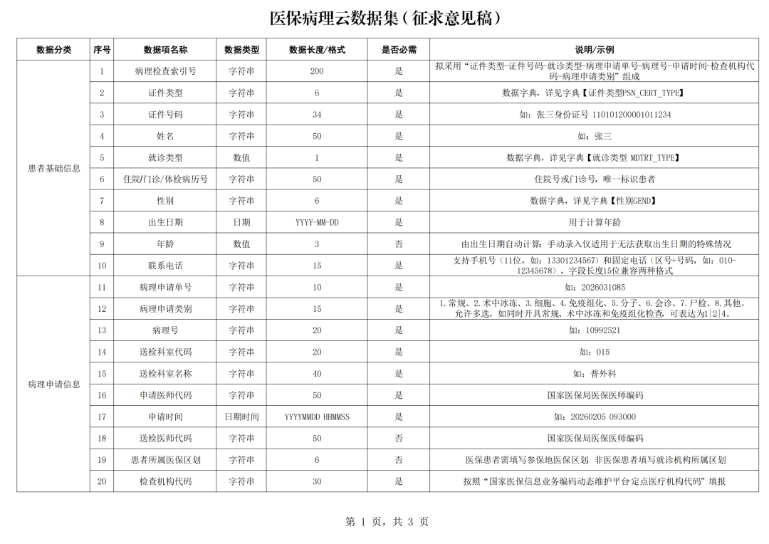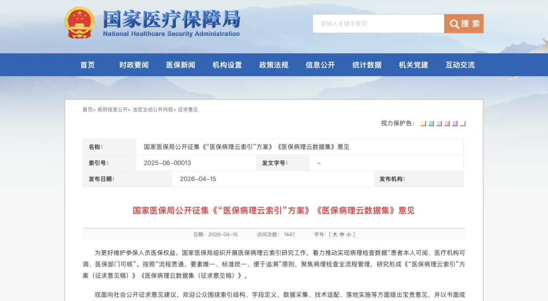 2026年4月15日,国家医疗保障局发布《“医保病理云索引”方案(征求意见稿)》《医保病理云数据集(征求意见稿)》(简称《索引》《数据集》),面向社会公开征求意见建议。