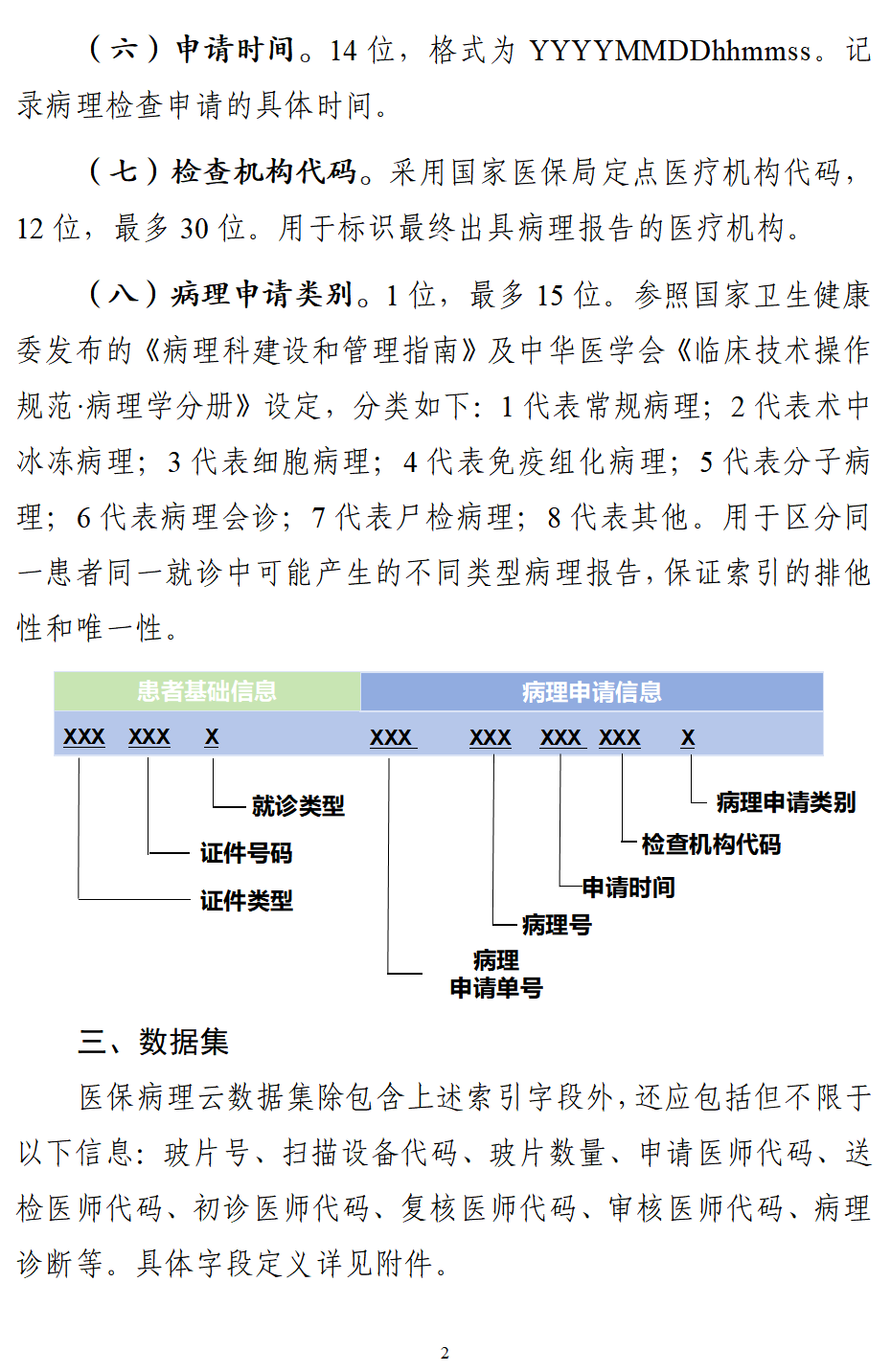 《数据集》除包含上述索引字段外,还应包括但不限于以下信息:玻片号、扫描设备代码、玻片数量、申请医师代码、送检医师代码、初诊医师代码、复核医师代码、审核医师代码、病理诊断等。
