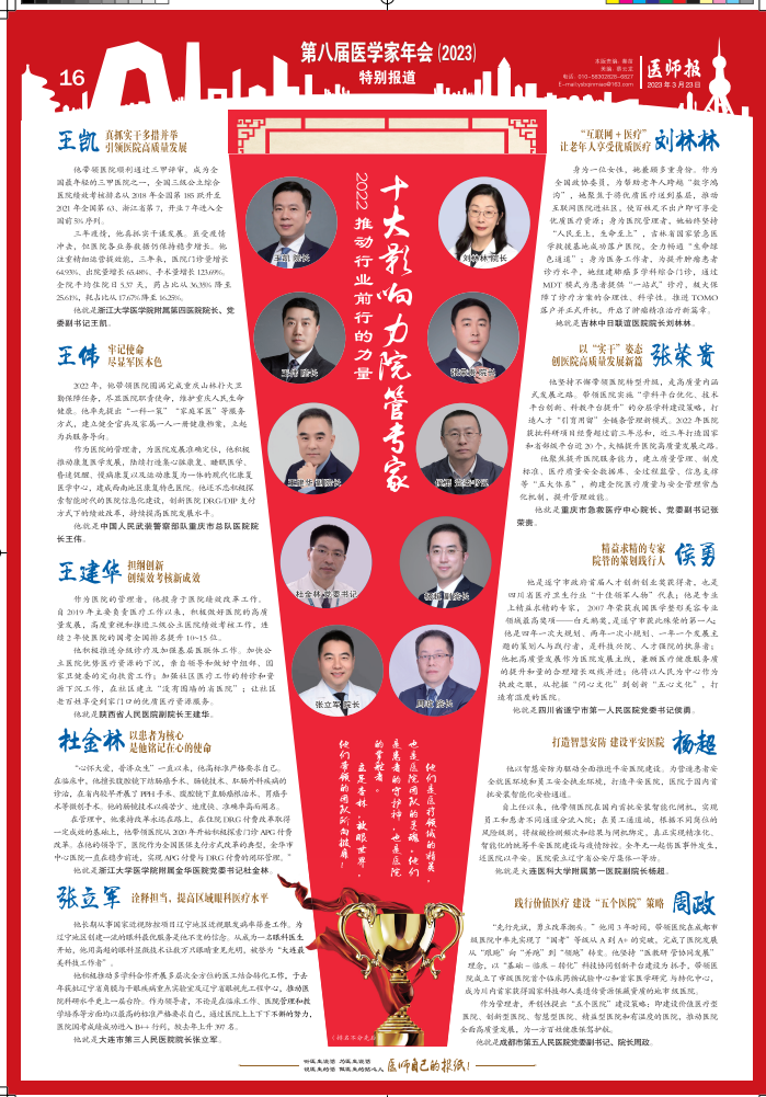 医师报讯(融媒体记者 管颜青 通讯员 王芳)九岁是孩童茁壮成长的关键期,也是一家医院躬身奋进、沐光而行的宝贵年华。 提起义乌,很多人会想到它是“小商品海洋,购物者天堂”。在这座充满无限活力和可能性的城市里,将近九岁的浙江大学医学院附属第四医院(简称“浙大四院”)正迎着时代的主旋律书写着属于她的传奇。五岁那年,王凯从浙大二院赴任浙大四院,此后,医院在缺乏可复制的经验下形成了“三院一体”的发展模式。短短三年,年轻的医院从浙中西老百姓家门口的省级医院,到全国三级公立医院“国考”中最年轻的“A+等级医院”,再到浙中西首家高校附属省级“三级甲等综合医院”,走出了一条富有特色的公立医院高质量发展之路。 在新时代新挑战的征程中,如何心怀"国之大者",奋力"走在前列",勇立潮头,这是挑战,更期待奔赴辉煌的未来。作为浙大求是特聘医师的王凯院长,逐梦前行。 王凯 浙江大学医学院附属第四医院院长 浙江大学医学院附属第四医院和“一带一路”国际医学院党委副书记