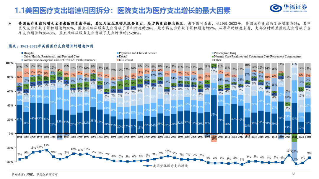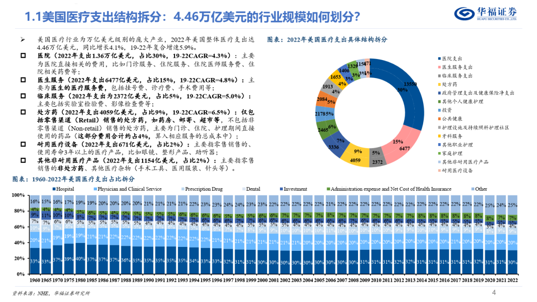 同时,美国的医疗总消费为世界之最,是美国军费开支的5倍多。据美国国家卫生健康费用(NHE)数据,2022年美国医疗总费用4.46万亿美元,占GDP比例达17.3%。