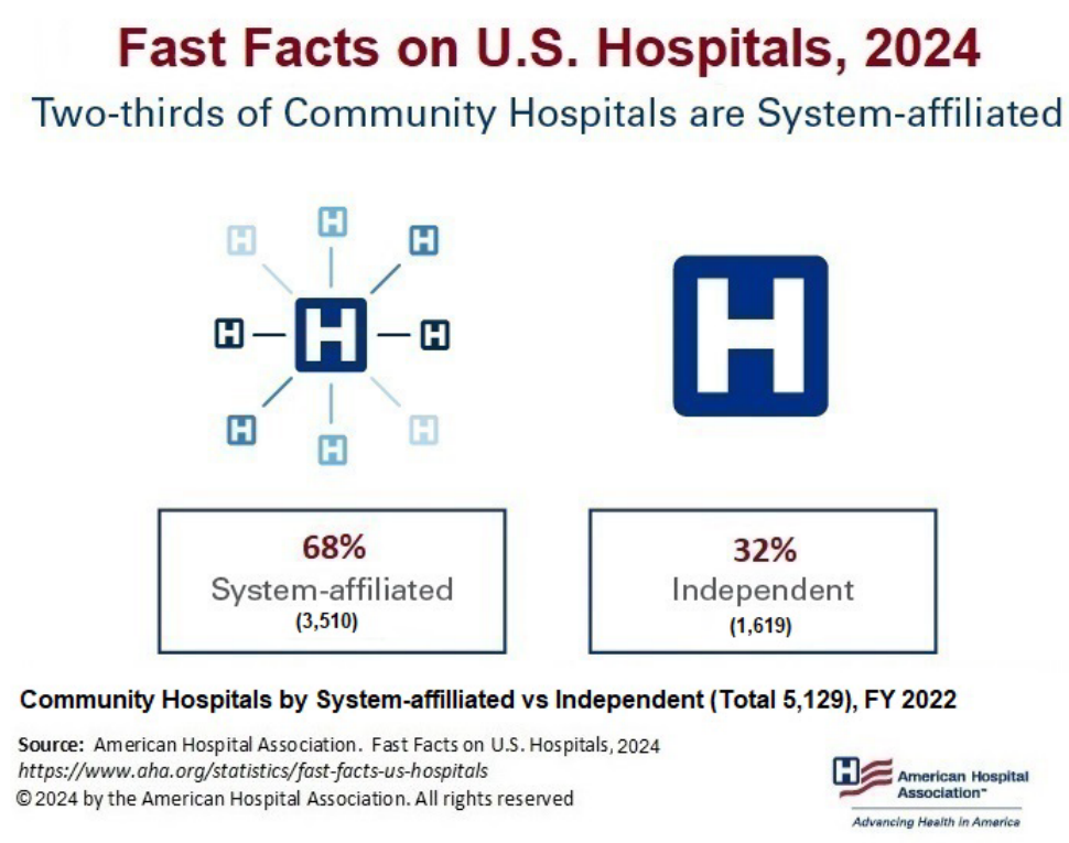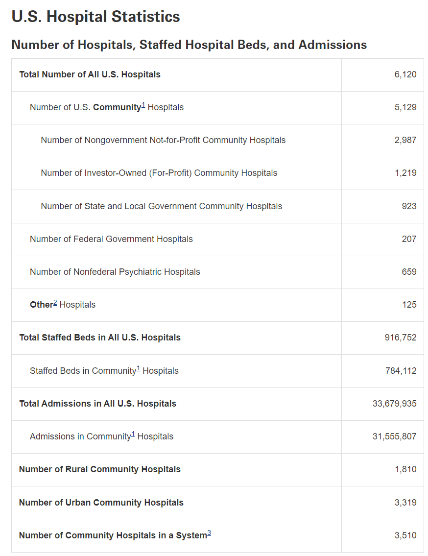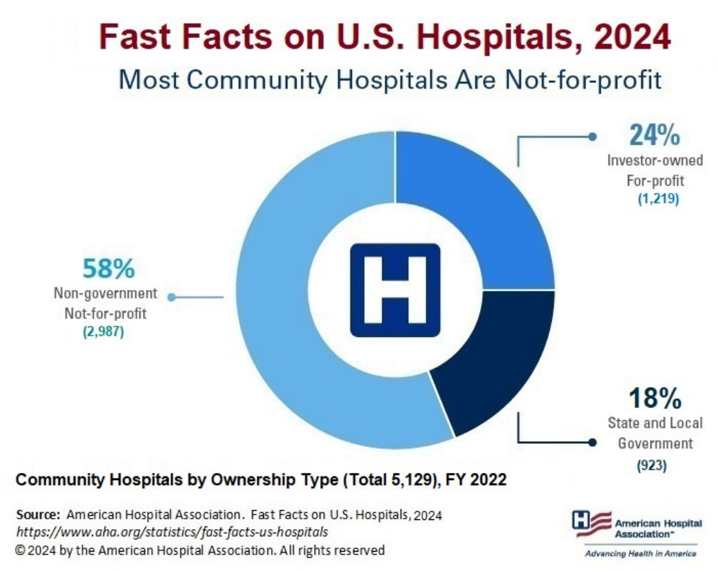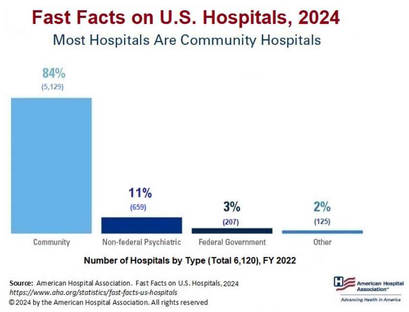 根据美国医院协会(AHA)2024年1月发布的《Fast Facts on U.S. Hospitals, 2024》(数据来自 2022 财年),美国共有6120家医院, 其中社区医院5129家,占总数的84%。绝大多数医院是非盈利性医院,占总数的80%以上。另外有1000多家私人盈利性医院,占总数的15%左右。