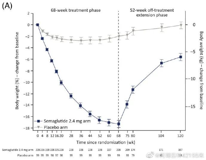 刚才说到司美格鲁肽可以减肥,但是,但是啊!接下来的进一步试验发现,停药一年后,减下去重量的2/3又回来了!几乎一下回到解放前。而且,这些受试者当初所获得的心血管效益也消失殆尽。这个图可以看出体重反弹一目了然啊同志们。