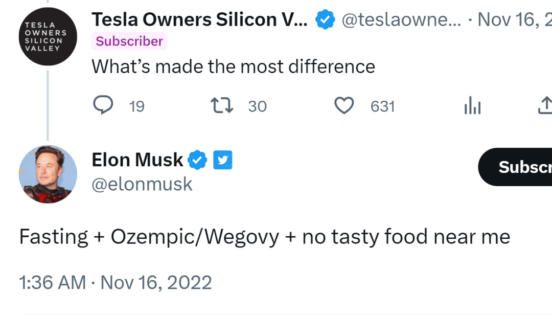 所以马斯克并不是仅仅靠打减肥针,他也通过阶段性节食、控制身边食物等方法几管齐下才达到目标的。