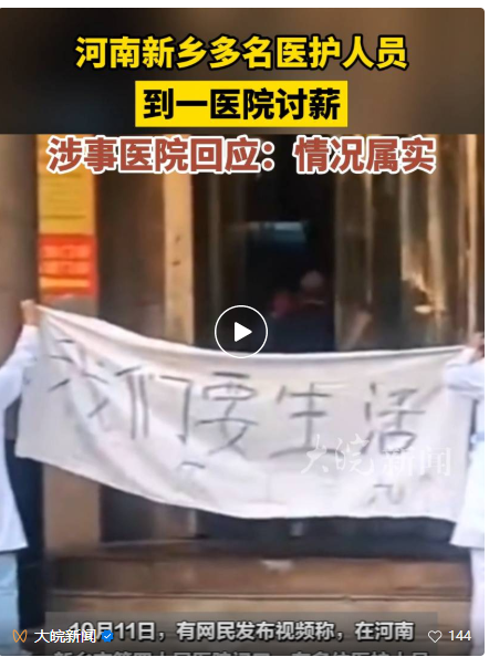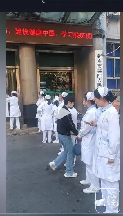 据知情人士介绍,这些白大褂人员系医院工作人员,他们被拖欠了薪水,视频中显示的医院门牌正是新乡市第四人民医院。