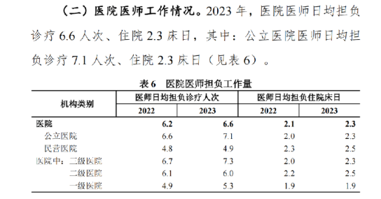 总体来说,2023年,医院医师日均担负诊疗6.6人次,比上一年增加0.4人次;住院2.3床日,比上一年增加0.2床日。其中,公立医院医师日均担负诊疗7.1人次、住院2.3床日,比上一年均有所增加。