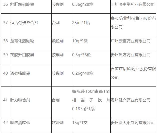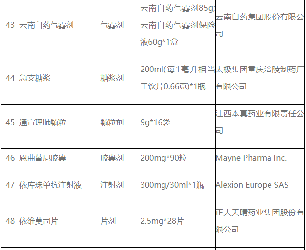 共计58个品种,包括46个西药(其中生物制剂4个,化药42个),12个中成药。其中有创新药,也不乏芪胶生白胶囊、云南白药气雾剂、急支糖浆、通心络胶囊等中药老品种。