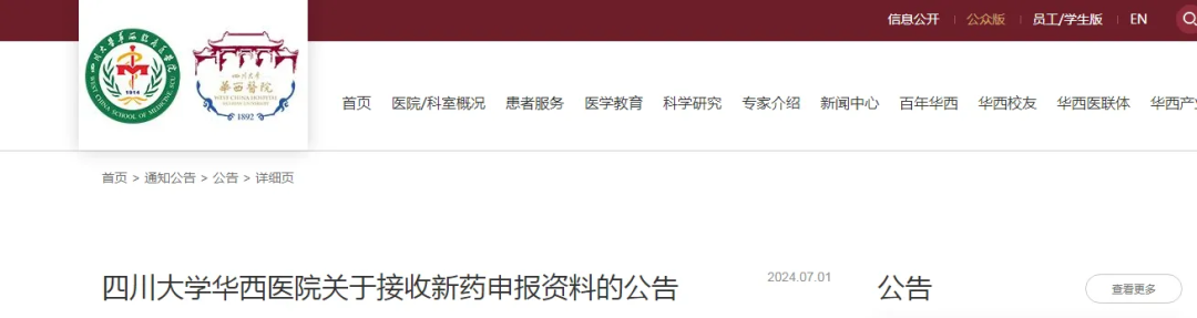 10月21日,四川大学华西医院官网发布了2024年度的《新药引进公告》。