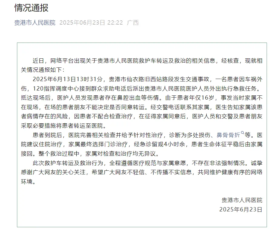 此次救护车转运及救治行为,全程遵循医疗规范与家属意愿,不存在非法强制情况。诚挚感谢广大网友的关心关注,希望广大网友不轻信、不传播不实信息,共同维护健康有序的网络环境。