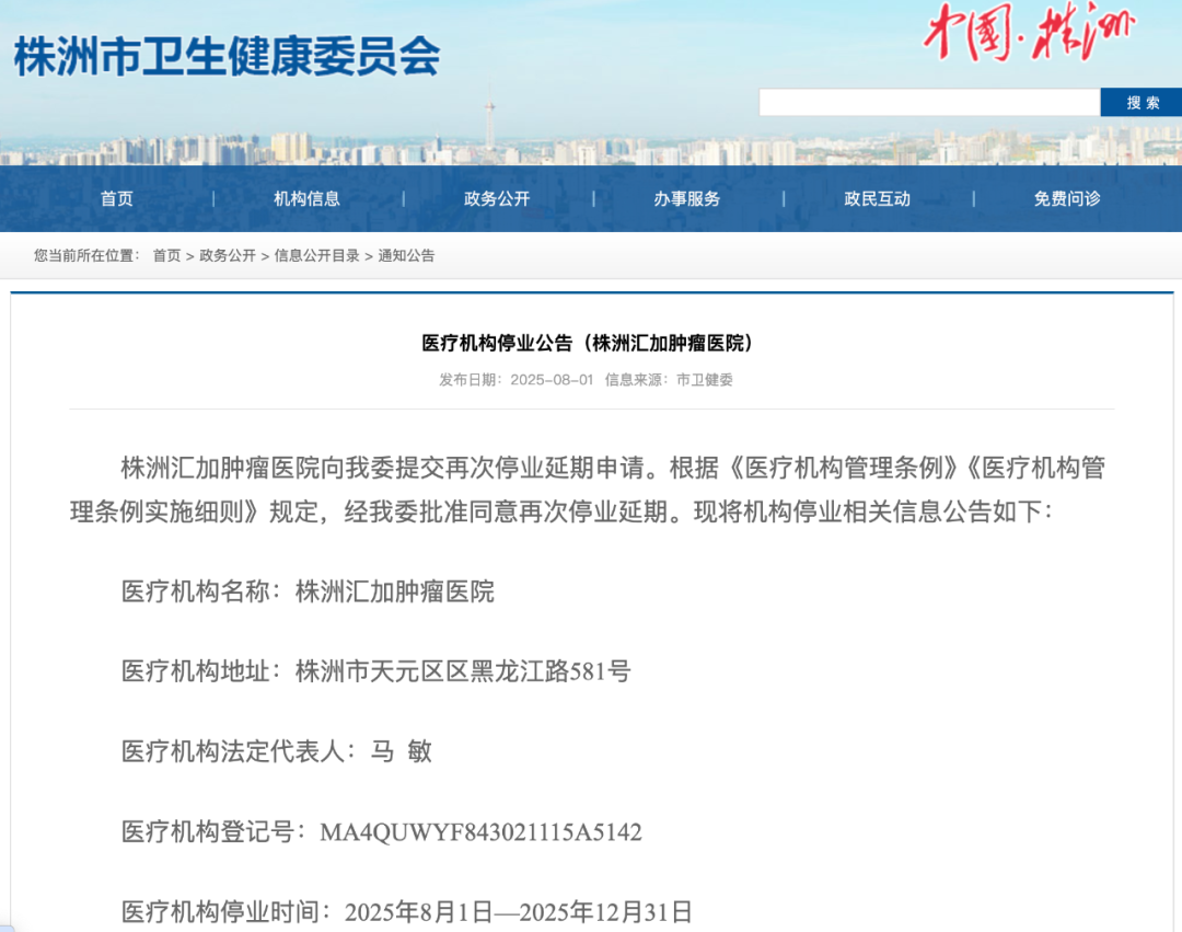 第一次申请停业的具体时间,医院官方并没有公布。根据株洲市卫健委官网通报,此次汇加肿瘤医院延期批准至今年 12 月 31 日,按照延期最长期限不超 1 年来算,不难推测很有可能今年年初医院就提交了停业申请。