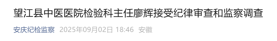 9月2日,据安庆纪检监察微信公众号消息,安徽省安庆市望江县中医医院检验科主任廖辉涉嫌严重违纪违法,目前正接受望江县纪委监委纪律审查和监察调查。