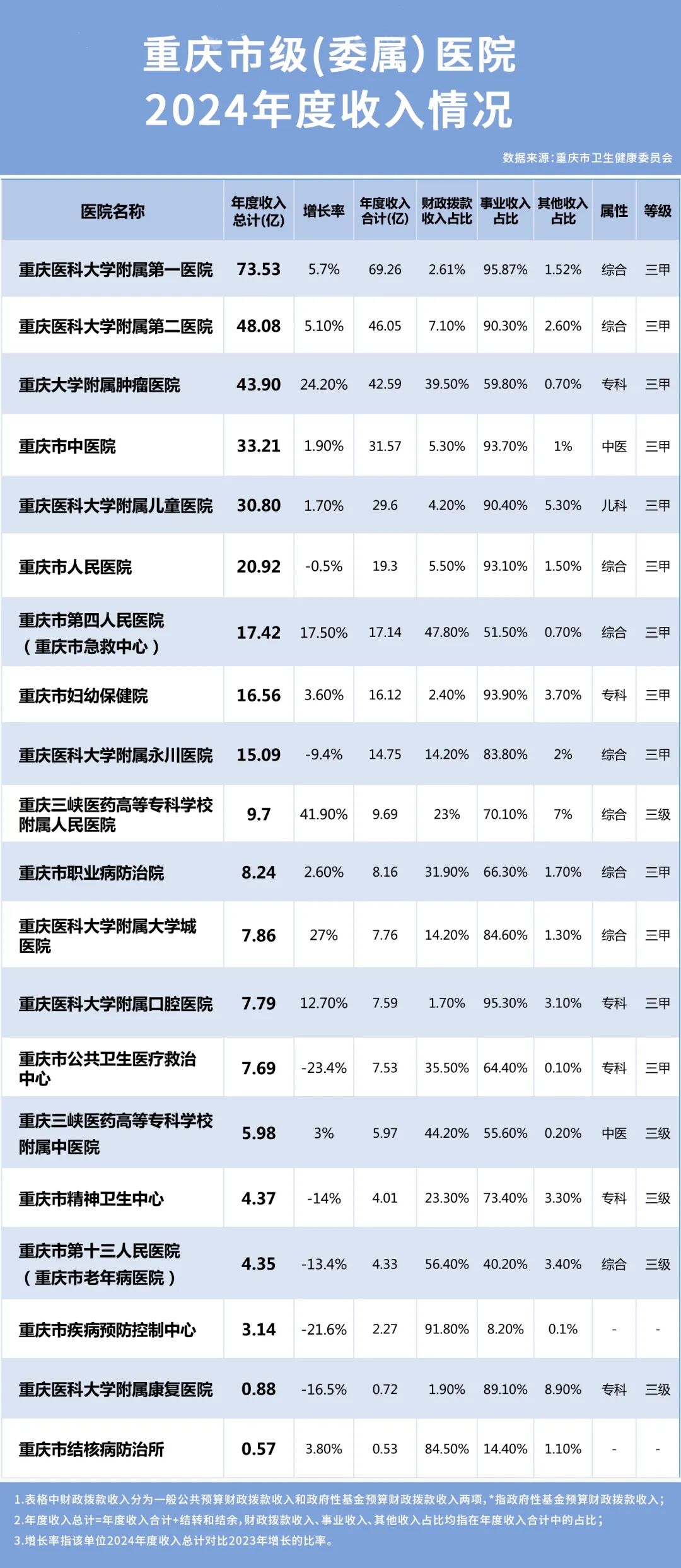 73.53亿位居第一!重庆20家市级医院年度收入情况公布