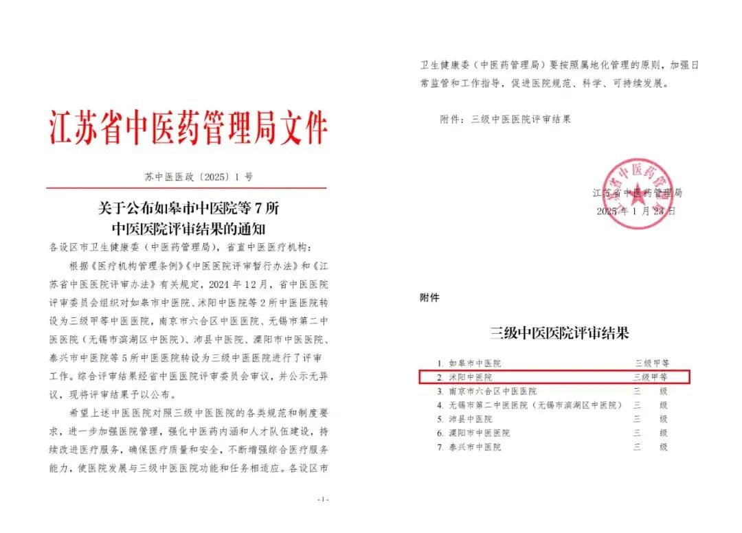2025年上半年,江苏省公布了《关于如皋中医院等7所中医医院评审结果的通知》,其中,沭阳中医院被评为三甲医院,这是全国社会办医首家三级甲等中医院,令人瞩目。截至目前,宿迁市三甲医院已增加到4所,其他3所分别为江苏省人民医院宿迁医院、南京鼓楼医院集团宿迁医院、宿迁市中医院。