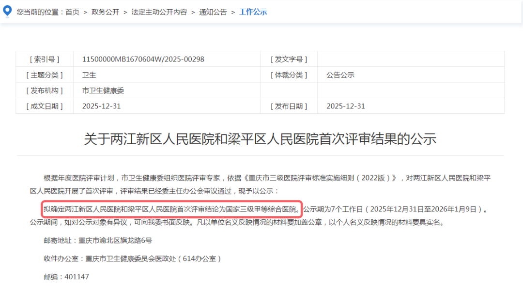 2025年12月31日,重庆市卫生健康委员会发布了《关于两江新区人民医院和梁平区人民医院首次评审结果的公示》,拟确定两江新区人民医院和梁平区人民医院首次评审结论为国家三级甲等综合医院。公示期为7个工作日(2025年12月31日至2026年1月9日)。