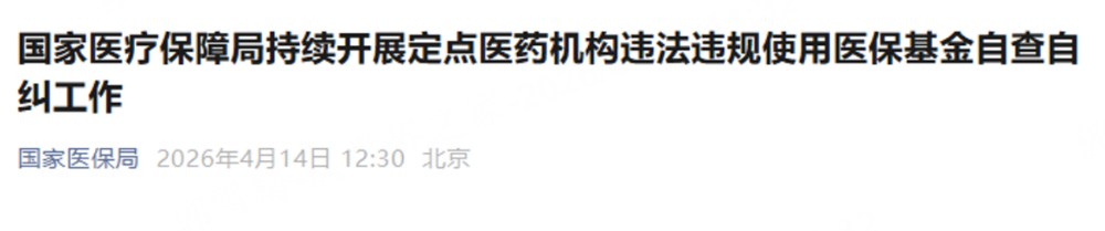 4月14日,“国家医保局”微信公众号发布消息称,近日,国家医保局在全国范围内组织开展2026年定点医药机构违法违规使用医保基金自查自纠工作。自查自纠聚焦重点领域“逐渐细化、持续深化”。在既往心血管内科、骨科、血液净化、康复、医学影像、临床检验、肿瘤、麻醉、重症医学等9个重点领域的基础上,本年度进一步将口腔、内分泌、精神医学3个领域纳入自查自纠范围。各地医保部门以此为基础,结合实际组织开展自查,确保全面覆盖、不留死角。一是细化制定本地清单。国家医保局已下发2026年定点医药机构违法违规使用医保基金典型问题清单,各地医保部门已于3月底前结合本地医保政策、诊疗项目规范,对问题清单进行细化完善。二是组织全面自查。各地医保部门组织辖区内所有定点医药机构,对照本地化问题清单,于4月底前完成对2024年至2025年期间医保基金使用情况的全面自查,并及时追回违规使用的基金。三是开展抽查复查。5月起,国家医保局将组织对各地自查自纠情况进行抽查复查。国家医保局称,本次全国范围内定点医药机构的自查自纠工作,是持续保持基金监管高压态势、推动监管关口前移的重要举措。通过引导定点医药机构压实自我管理主体责任,进一步筑牢基金安全防线,提升基金使用效能,守护好人民群众的“看病钱”“救命钱”。