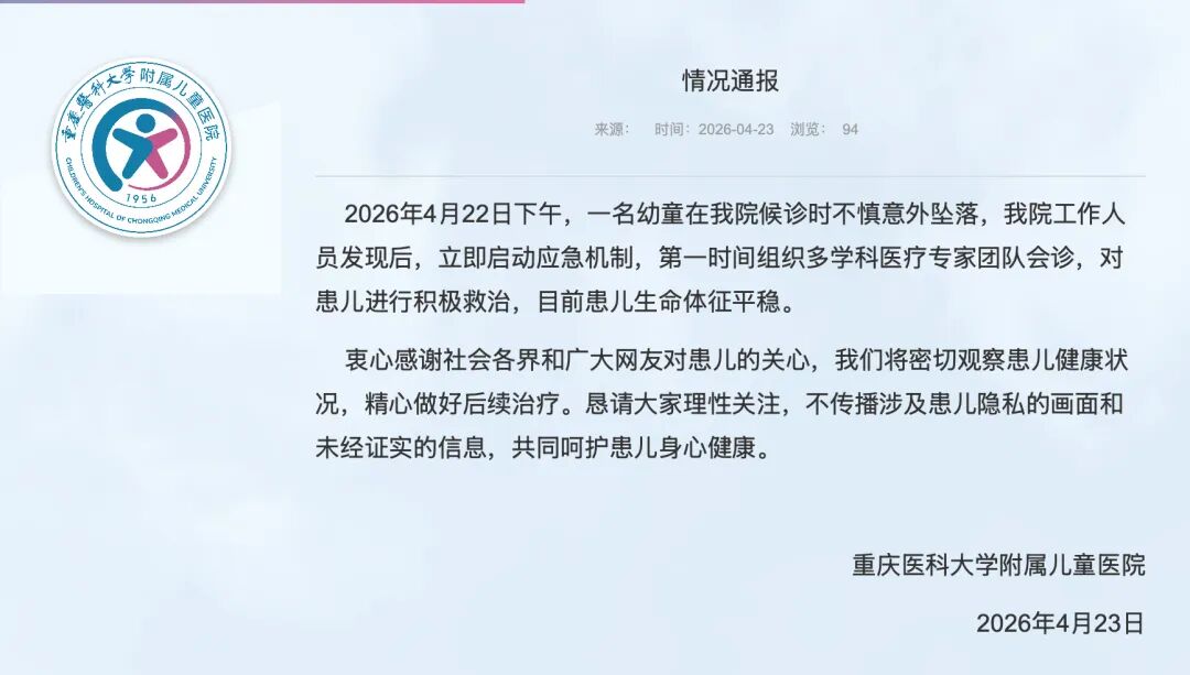 4月23日下午,重庆医科大学附属儿童医院发布情况通报,全文如下: