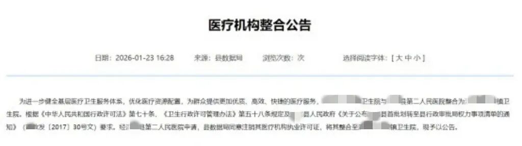 近日,某县数据局发布《医疗机构整合公告》。为进一步健全基层医疗卫生服务体系,优化医疗资源配置,某镇卫生院与县第二人民医院整合为某镇卫生院。根据相关规定,经县第二人民医院申请,县数据局同意注销其《医疗机构执业许可证》,将其整合至某镇卫生院。 公开资料显示,县第二人民医院为公立二级综合医院。早年全院占地7000余平方米,业务用房面积约3500平方米,开放床位90张。医院开设内科、外科、妇产科、五官科、眼科、皮肤科、中医科、预防保健科等临床科室和医学检验科、影像科、超声、心电等功能科室。2020年8月,因老城区改造,医院迁至原县妇幼保健院院址。 2021年7月,县卫健委在《对县十四届人大六次会议第137号建议的答复》中透露,县第二人民医院(县老年病医院)项目已经启动,该项目整合县原县第二人民医院、某医院医疗资源,总投资3200万元,新建一幢5层的住院楼和一幢2F门诊楼,总建筑面积约为9000㎡,总用地面积20038㎡,将建成一所集医疗、康复、养老为一体的医养结合型二级综合医院。 据官方2024年报道,县第二人民医院新建项目正加快推进附属设施建设,预计于当年2月投入使用。该项目按照二级综合医院设置标准,规划总床位150张。 某镇卫生院是一所集医疗、预防、保健为一体的综合性公立医院。医院内设住院病房,预防保健科、内科、中医科、妇科专业、口腔科、医学检验科、医学影像等科室。 二级医院的资源整合到乡镇卫生院, 原因何在? 有业内人士分析认为,导致县第二人民医院被整合的原因是多方面且深层次的。近年来,该县大力推进紧密型县域医共体建设,核心就是组建以县第一人民医院为总医院,统辖12个镇卫生院的“1+1+12”体系。在这种“一盘棋”的管理模式下,重复建设、功能重叠的机构进行整合是必然趋势。上级医保政策也明确鼓励优化资源,支持医共体内实行“总额预拨、结余留用”的打包付费方式,这从经济机制上激励了体系整合,避免资源浪费。 其次,龙头医院的虹吸与扩张效应不容忽视。高德地图显示,县第二人民医院距县第一人民医院约4.3公里,车程15分钟;距县人民医院约3公里,车程10分钟。 县第一人民医院成立于2010年,是一所公立二级甲等综合性医院,由市第一人民医院全面托管,并成为其院区。按照“县级举办、市院管理、合作共赢、争创一流”的目标,当地政府曾投入5亿元建设新院区。新院区占地约192.7亩,总建筑面积11.7万余平方米,设置床位1000张,于2017年9月全面投入使用。这家区域医疗“航母”的崛起,吸引了大量患者和优质医疗资源,使得规模较小、定位相近的第二人民医院生存空间受到挤压,其原先规划的“老年病医院”转型路径也可能被总医院相关科室所覆盖。 县人民医院同为二级甲等综合医院,总院占地面积5.5万平方米,开放床位340张。截至2024年,医院设有急救、检验、影像等十大中心,拥有心内科、消化内科、普外科、神经外科等4个市级重点专科,2024年又与淮安市第一人民医院建立医疗集团合作关系。医院共设临床医技科室34个,覆盖内、外、妇、儿等专业。 此外,基层服务能力的强化需求也促成了此次整合。根据公告,整合的目的是“健全基层医疗卫生服务体系,优化医疗资源配置”。将二级医院资源下沉,并入承担着大量基本公共卫生和常见病诊疗任务的镇卫生院,能够直接壮大基层力量。这符合国家“强基层”的医改方向,旨在让群众能在“家门口”享受到更优质的医疗服务,从而实现“小病不出镇”。 事实上,早在2023年,该县就已对多家镇卫生院进行过类似的优化整合。在紧密型医共体成为县域医改主框架的背景下,未来那些服务能力弱、区位重叠、存在价值不明显的“第二”、“第三”人民医院,被更具效率的医共体分院或特色专科医疗机构所取代或整合,将是大概率事件。 县域医疗资源的棋盘,正在被重新布局 无论是跨层级的整合,还是同级别的合并,其出发点都是为了优化医疗资源布局,提升服务效率,最终惠及县域居民。这也印证了医疗资源调控的灵活性原则,相关调整无需拘泥于机构层级和规模,关键要看是否符合区域医疗服务需求,是否能让群众享受到更便捷、优质的医疗服务。
