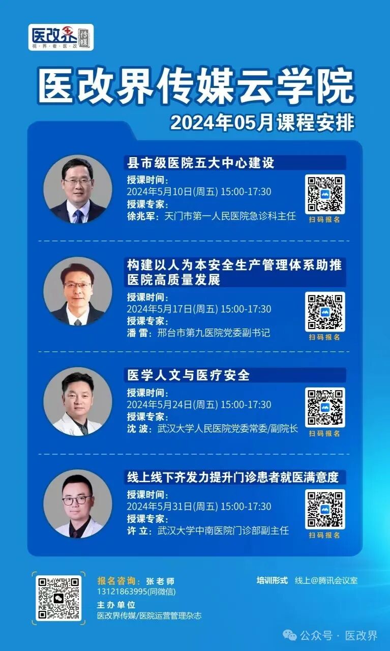 为全面贯彻习近平新时代中国特色社会主义思想和卫生健康工作方针,全面贯彻2024年全国卫生健康工作会议精神,深化拓展医药卫生体制改革,更加突出医疗卫生机构的内涵式发展,更加突出卫生健康服务的系统连续,以中国式现代化统领中国式现代医院运营管理,提升医院管理者、卫生健康领域相关人员能力素质,提高医院运营管理能力,针对三年新冠疫情防控转段以来,医院外部压力增加,内部运营困难凸显,需要进一步解放思想观念,加强科室与医院运营管理,着力优化各种结构,防范化解自身风险,保持科室与医院回升向好趋势,提升行政部门、医疗卫生机构、管理人员和业务人员等能力素质,医改界传媒云学院每月推出精品课程。现将2024年5月份相关课程通知如下: